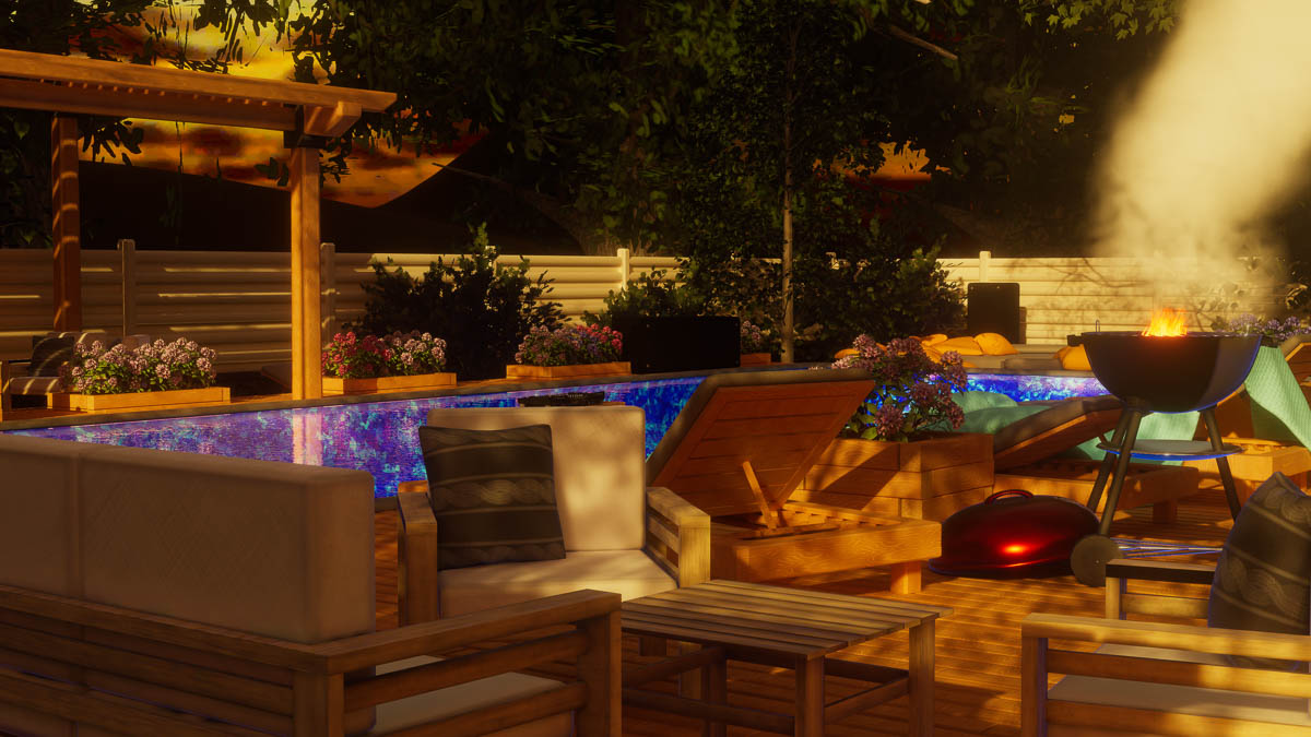 Realistic Pool / BBQ to fill out the empty backyard of a friend's house party space. Studied wood / deck construction to build the backyard board by board
