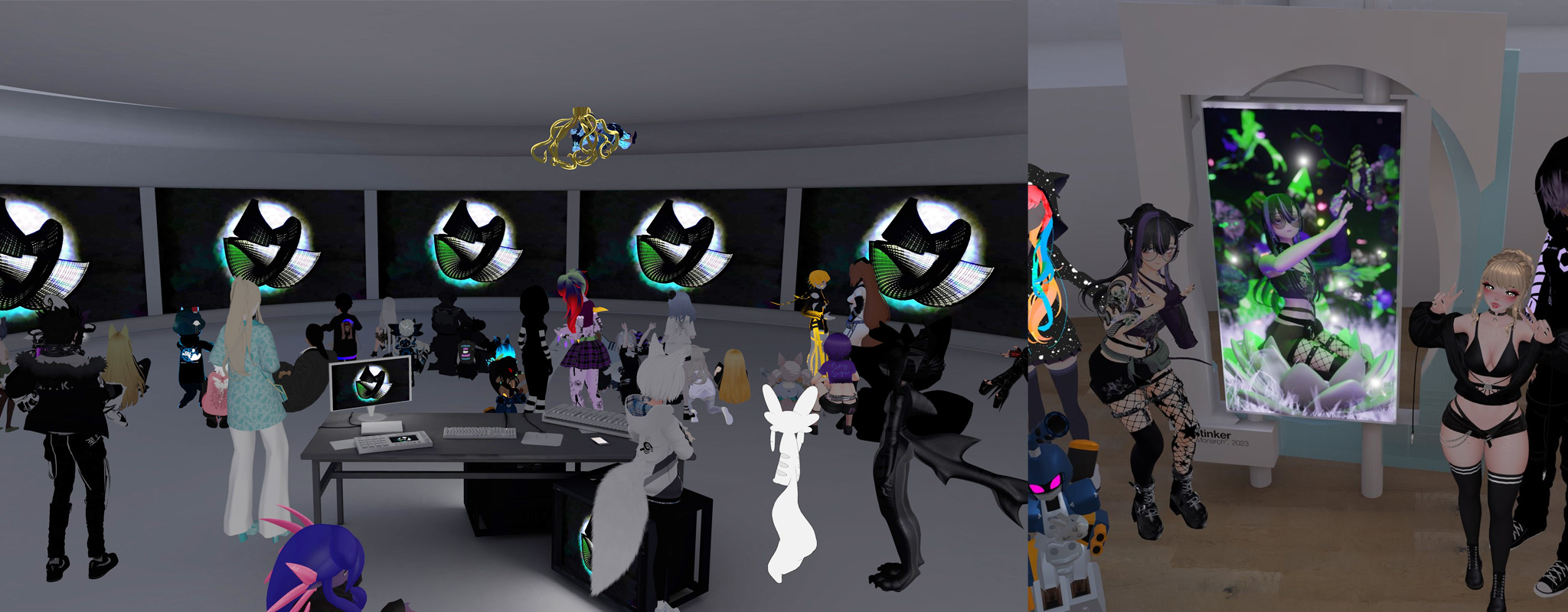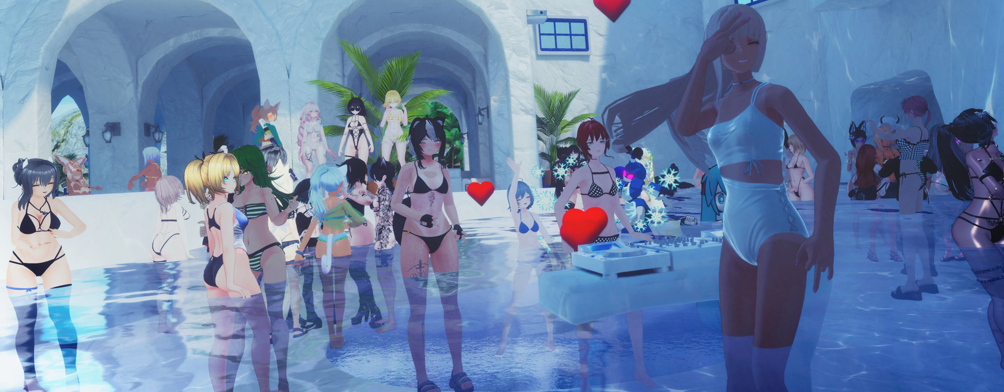 I wanted to subvert the bright neon and dark spaces of the existing rave scene, and share the taste of outdoor music that I love. Golden Sunset became a staple of the rave community, offering horizon views, green folliage, and no bright screens or stimulation. The event has inspired many in the community to create or don their own swimsuits to feel immersed in the world. Over two years I've now created 5 different pool party worlds, with the most recent version being selected to host an official VRChat party with the dev team.